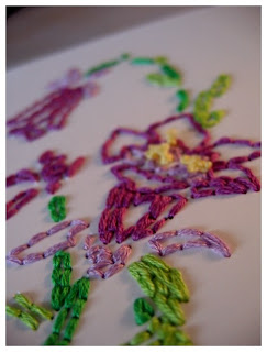 this is the front of a card i made for my roommate's sister's wedding. the image was taken from lollychops.com and translated into an embroidery pattern by me. i love the look of embroidered paper - things like this make me want to start my own business.